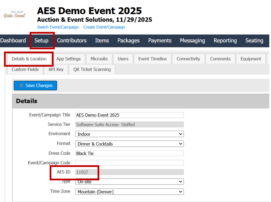 - Locate your AES Event ID in Auction Conductor under Setup > Details & Location > AES ID.