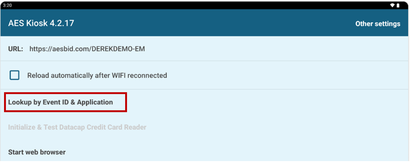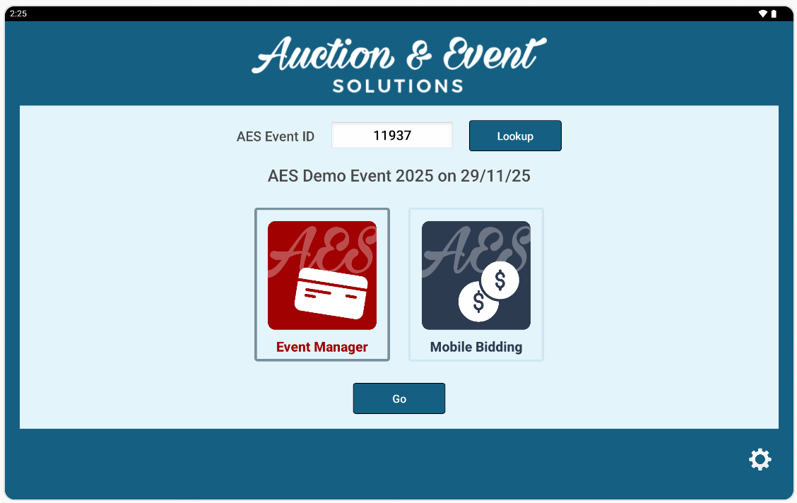 - At the AES start screen, enter your AES Event ID, press Lookup, select Event Manager, and click Go.