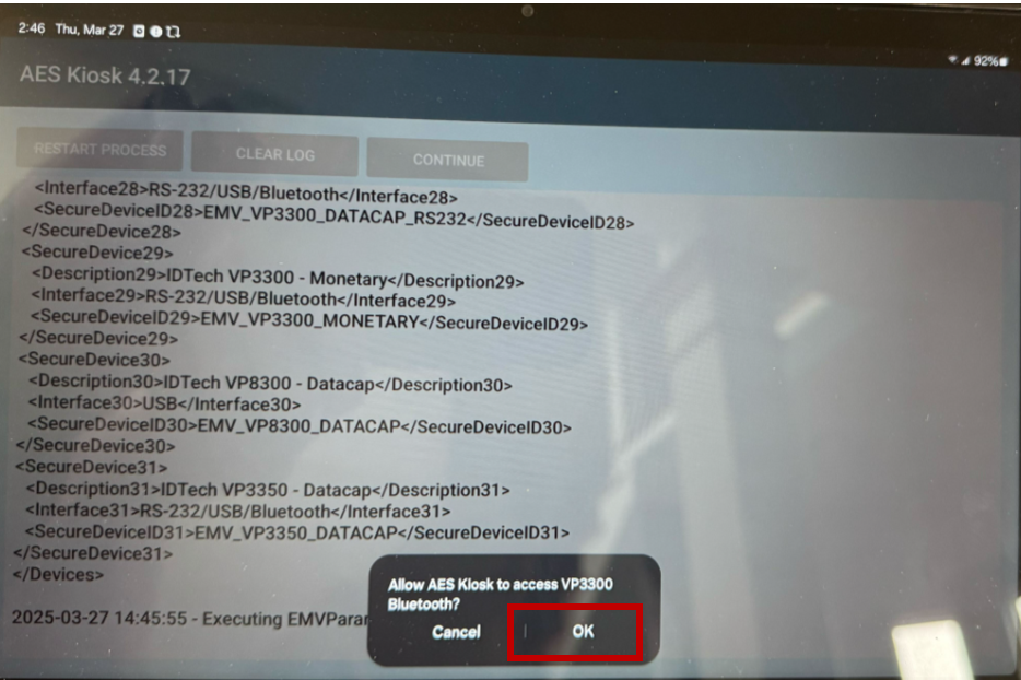 - When prompted, click OK to allow AES Kiosk to access VP3300 Bluetooth.