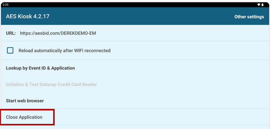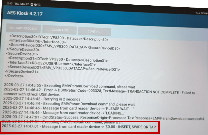 AES credit card readers require access to port 9000 using IPV4 protocol (not IPV6) to communicate with the processor. Verify your network allows access to https://dcap.com through Port 9000.