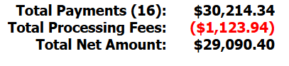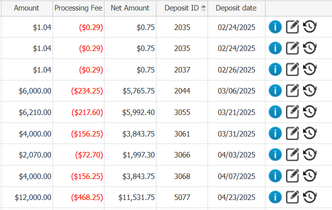 You'll see a detailed grid showing each credit card payment, including processing fees, net deposit amounts, and deposit ID with date information.