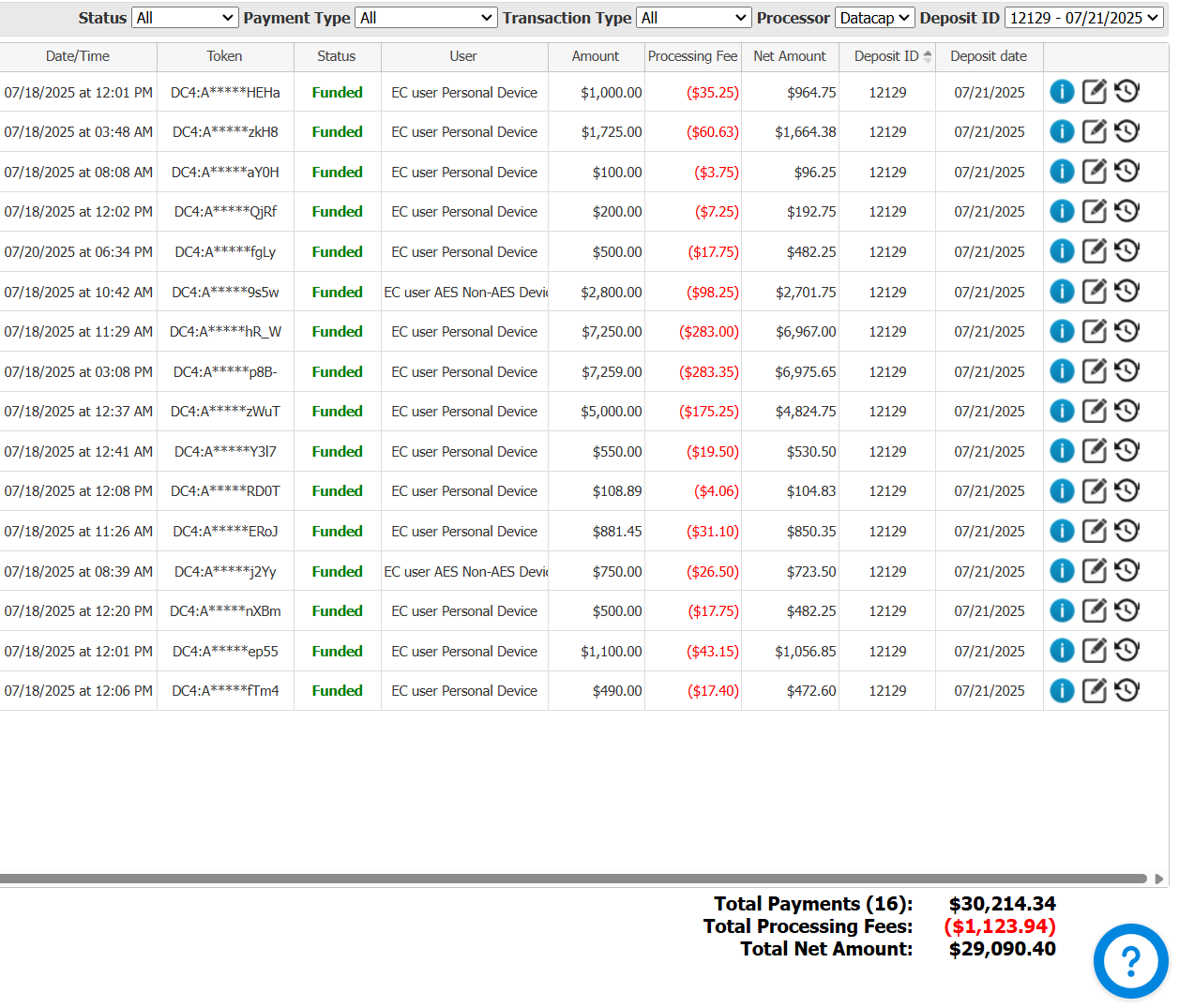 Select the deposit ID that matches the date you received funds in your bank account. Here, we've filtered for all transactions under deposit ID 12129 with a deposit date of 7/21/2025.
