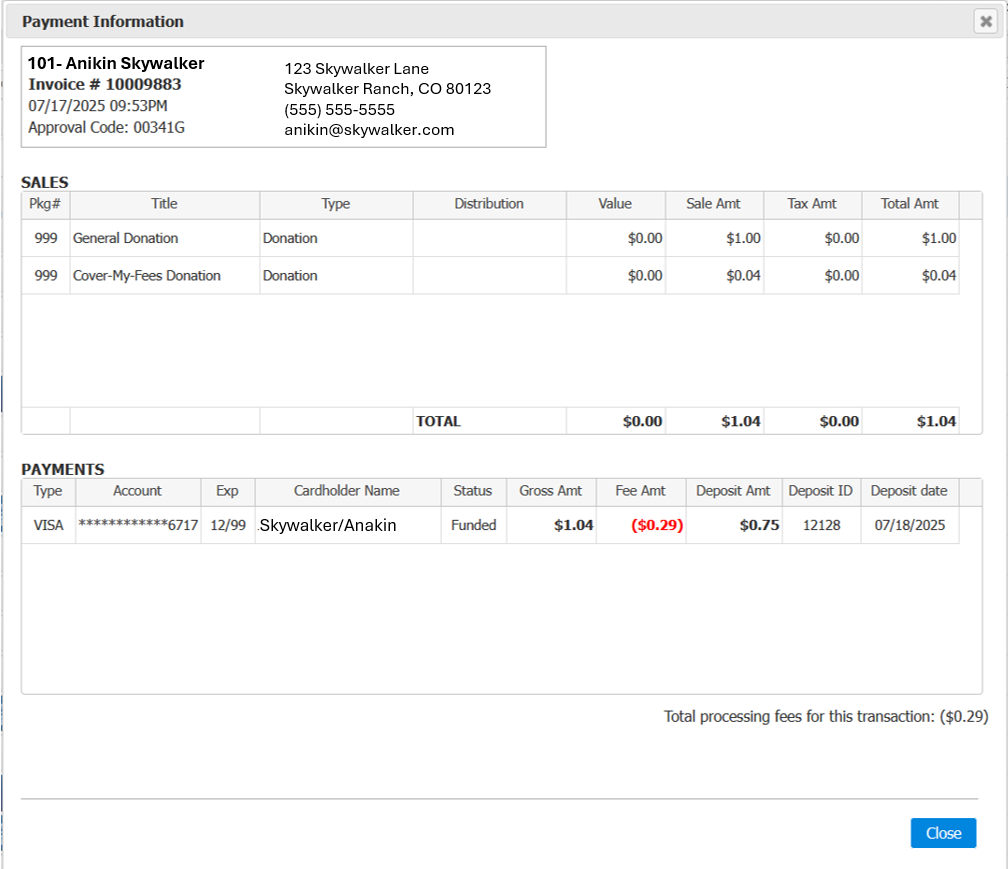 Each payment links to a specific contributor and shows details about their purchased packages and donations. Click the information icon or double-click any row to view these details.