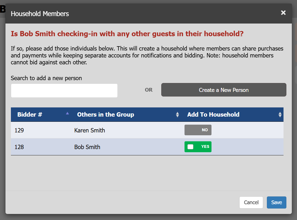 Confirm whether there are additional individuals in the household. Guests who wish to share purchases, bids, payments, or a credit card on file should be grouped within the same household. If the guest appears in the list provided, toggle the selection to “Yes.” You may also search for another individual or create a new profile to add them to the household.