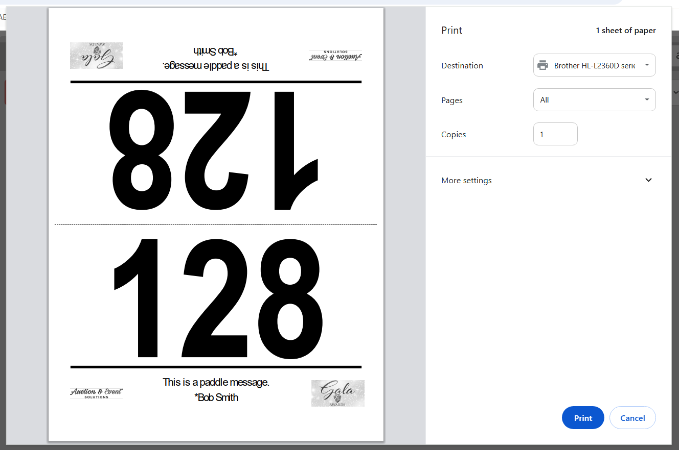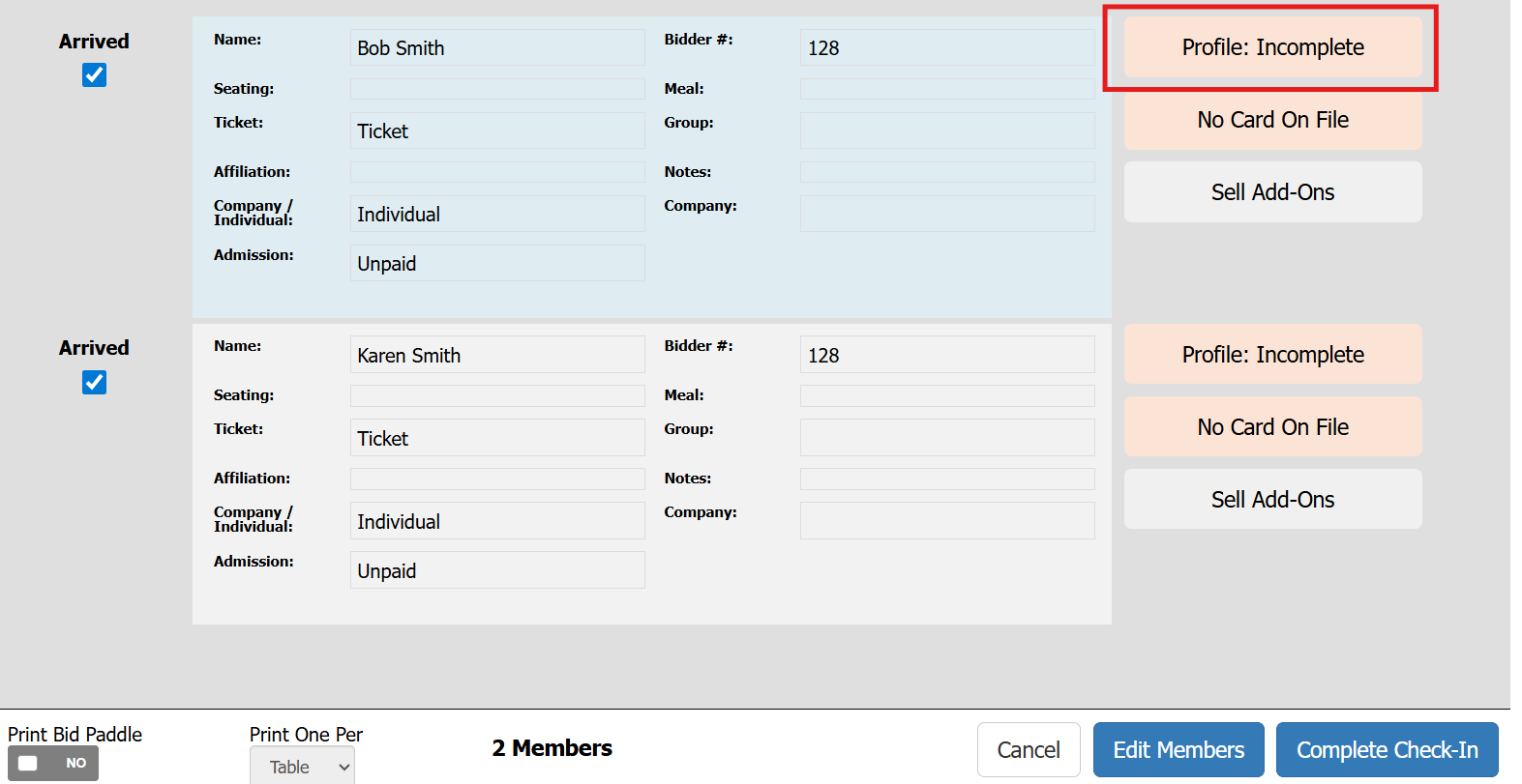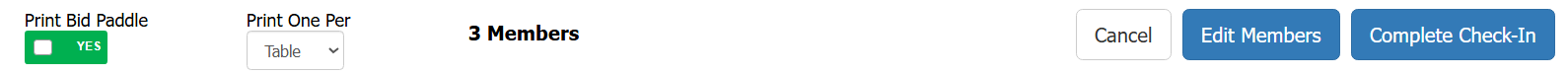 You can opt to print bid paddles during check-in by setting “Print Bid Paddle” to Yes (green). Then select whether to print one per table or per person.
