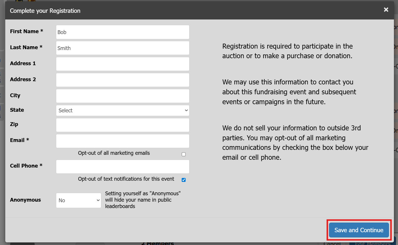 A common example is when a spouse was unintentionally set up separately but would like to bid, purchase, and pay together during the event. To add them:
