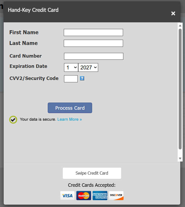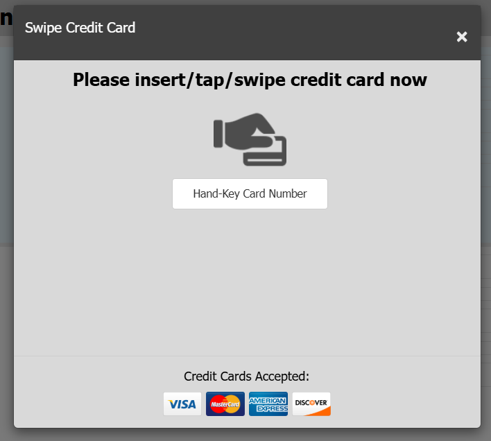 You will see a screen prompting you to swipe the credit card now. If the card will not swipe or you do not have an AES certified card reader attached, you may hand-key the card instead by clicking the button to pull up the hand-key form.