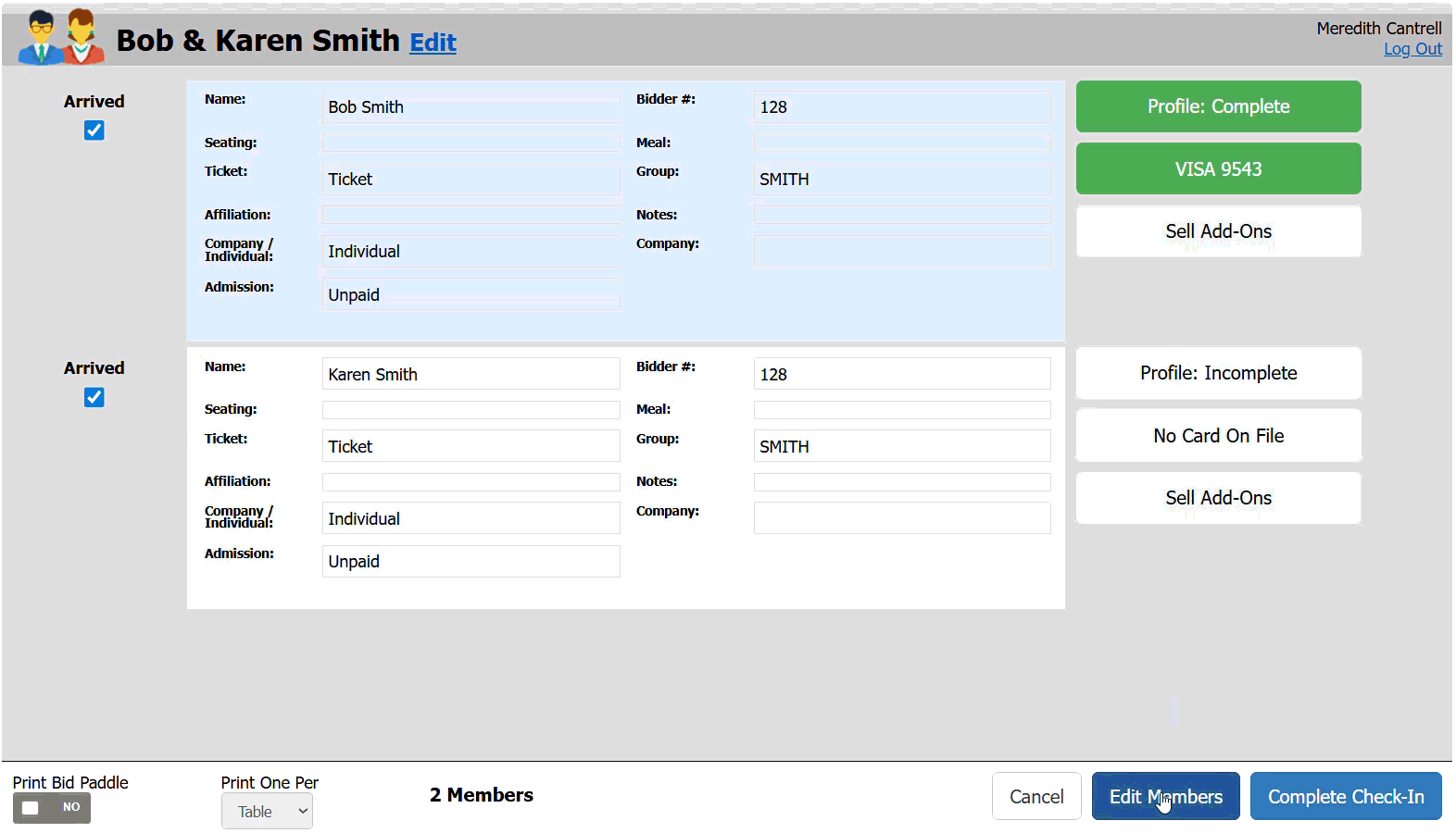 Overview of the event check-in process including: Collecting contact info, putting credit cards on file, associating households, and printing bidder paddles.