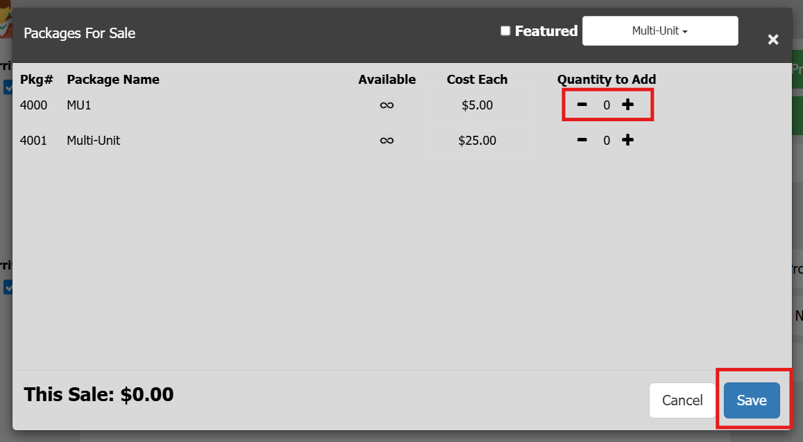 To sell multiple units during check-in, click “Sell Add-Ons.” Use the “+” and “–” buttons to adjust quantities for each add-on, then click Save.You can also add special notes, sell admission tickets, or assign a new table if needed. In most cases, this step is not required unless the contributor is new.