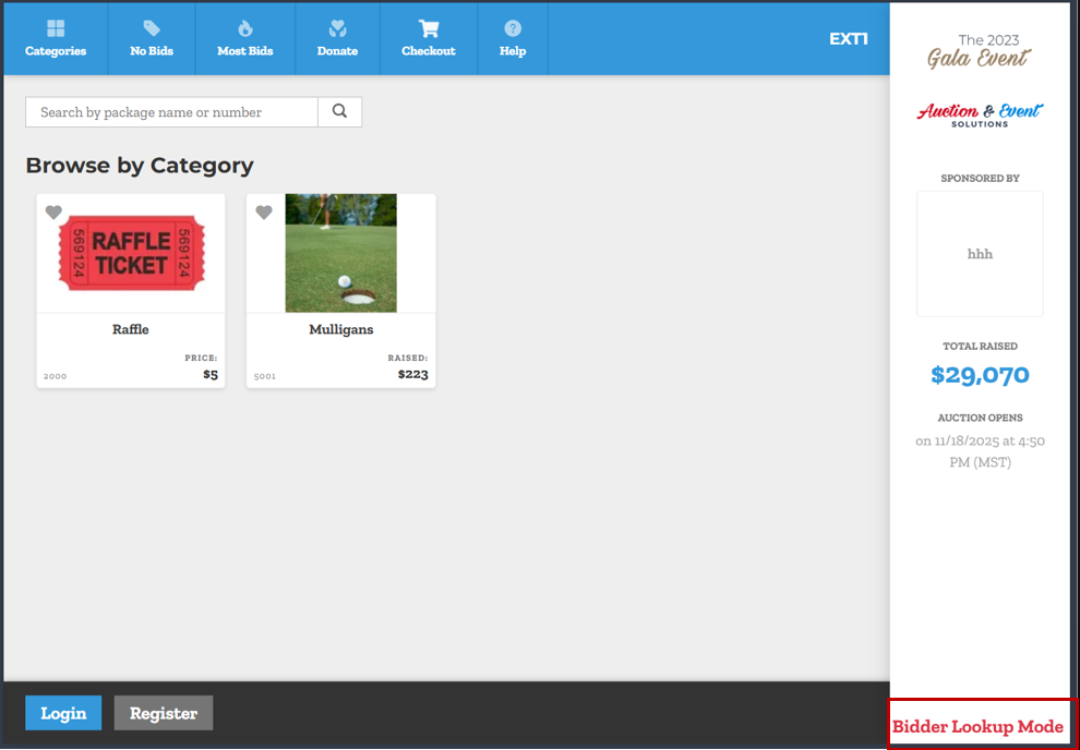 From any screen where a login button is present, the user will see a search bar as opposed to the usual field to enter the bidder number.