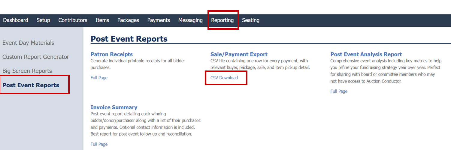 To access the export, navigate to Reporting > Post Event Reports > Sale/Payment Export > CSV Download
