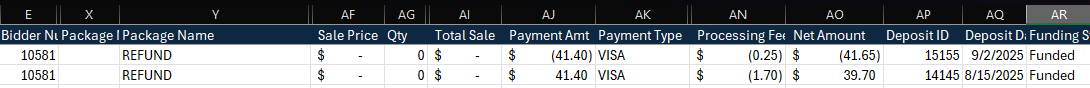 All payments are associated to sales in the system. When a contributor requests a full refund, the associated sale should be deleted to eliminate the balance due. However, the original payment authorization will still incur the processing fees, and the refund will also incur a $0.25 authorization fee. To account for these fees in the export, we insert two rows labeled "REFUND". Here, the first row is the refund and the second row is the original authorization.