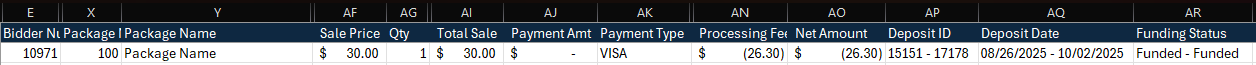 In the export, you will continue to see the original sale, but the payment, processing fees, and net deposit amounts adjusted to reflect the chargeback. You will also notice the two seperate deposit ID's and dates are accounted for here.