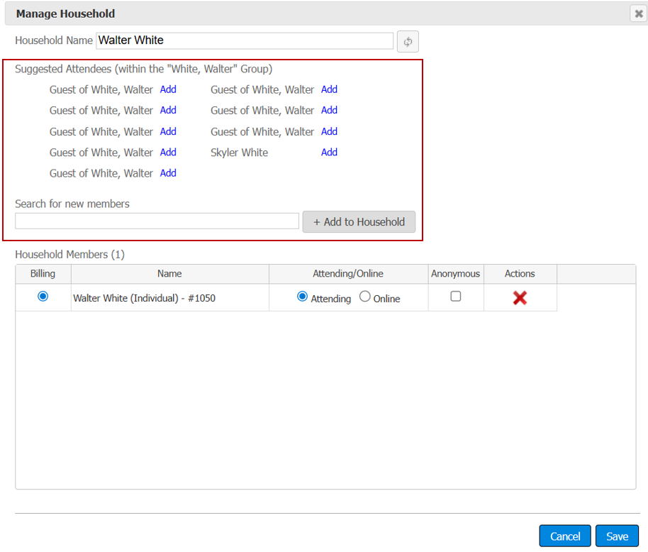 If the contributor purchased tickets with others (as part of a group), you'll see a list of suggested members to easily add to the Household. You can also search for and add other contributors who aren't in the original group.