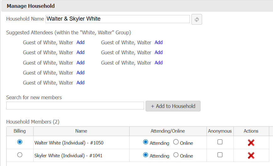 Every Household must have one Billing Contact. This person's name appears on PDF receipts, and their credit card is used for post-event batch charges when members have unpaid balances.