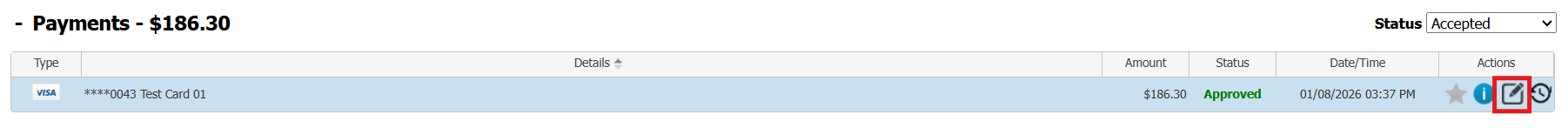 - To the far right of the payment you intend to partially refund, click the EDIT icon (not the refund icon)