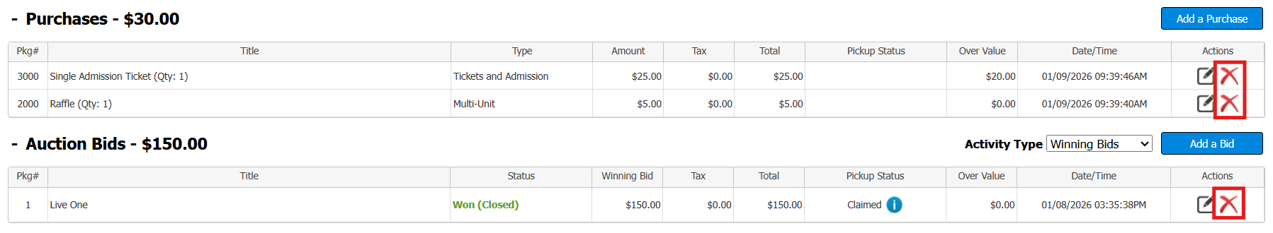 - The Delete icon, red 'X', will now appear to the right of the Purchase or Auction Bid associated with that refund