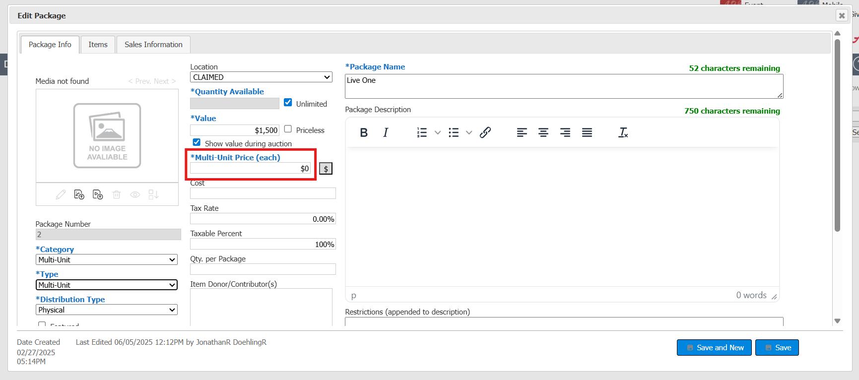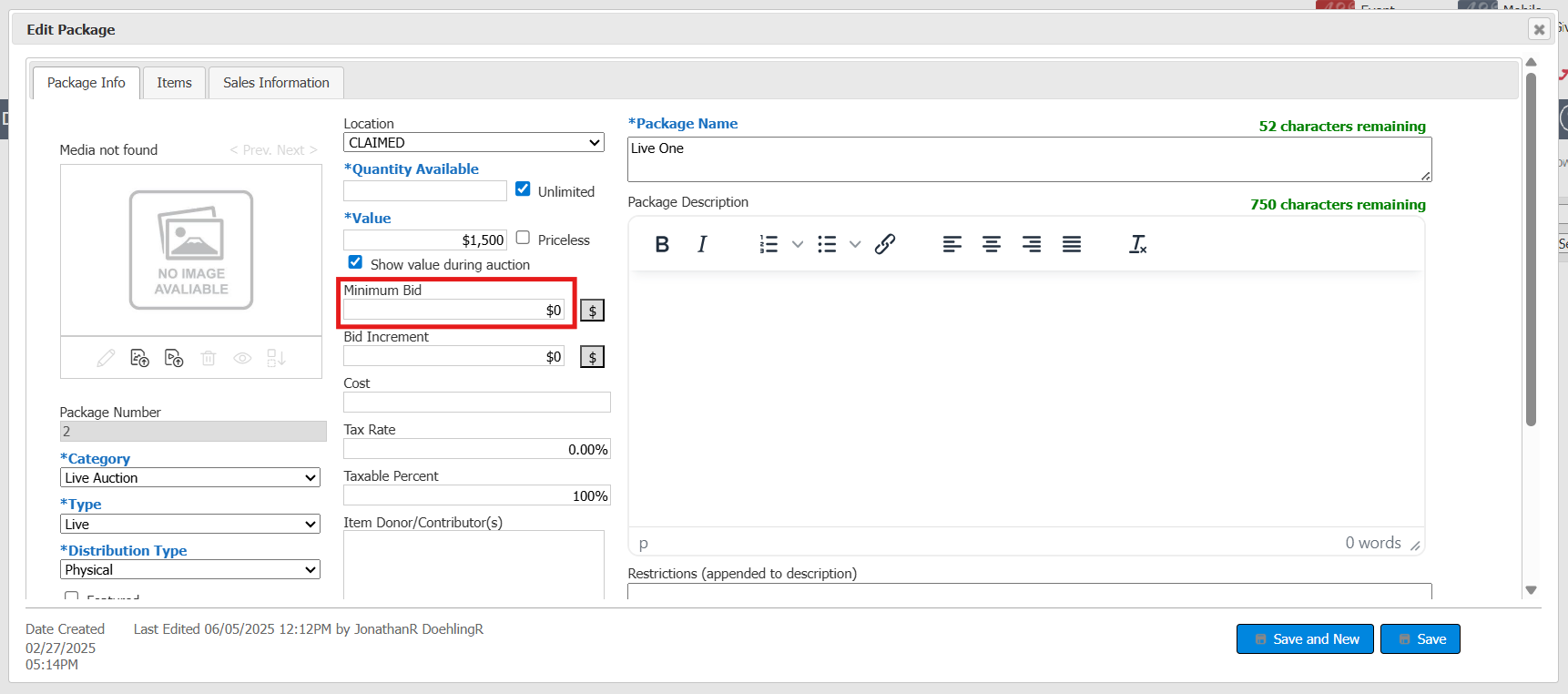 Silent and Live Auction Packages will require a Minimum Price change