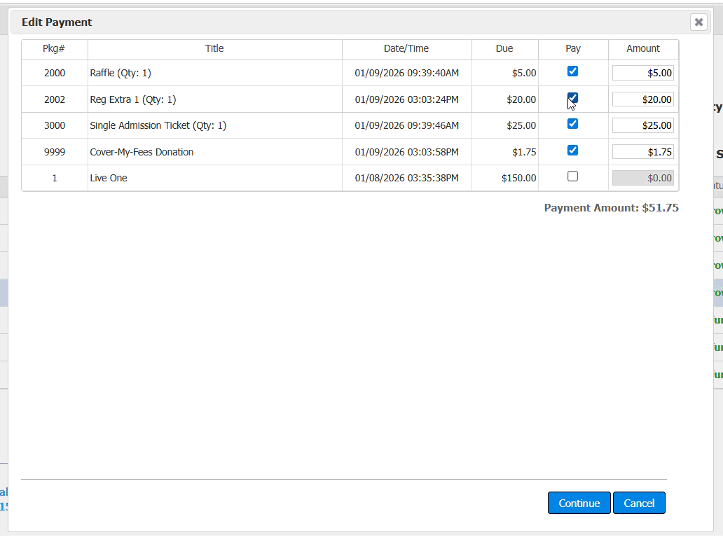 - Deslect the checkmark(s) in the Pay within the package row(s) you intend to refund.