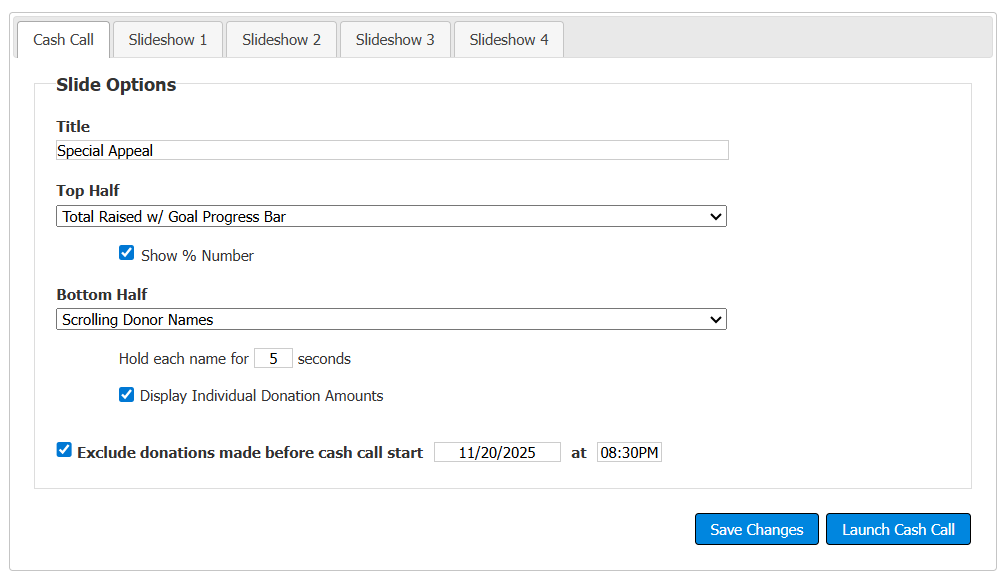 - Exclude donations made before cash call start - Select this if you prefer to display donations made solely during cash call, then set the start date and time of the cash call. If you want to include all donations made before the cash call, then you can ignore this option.