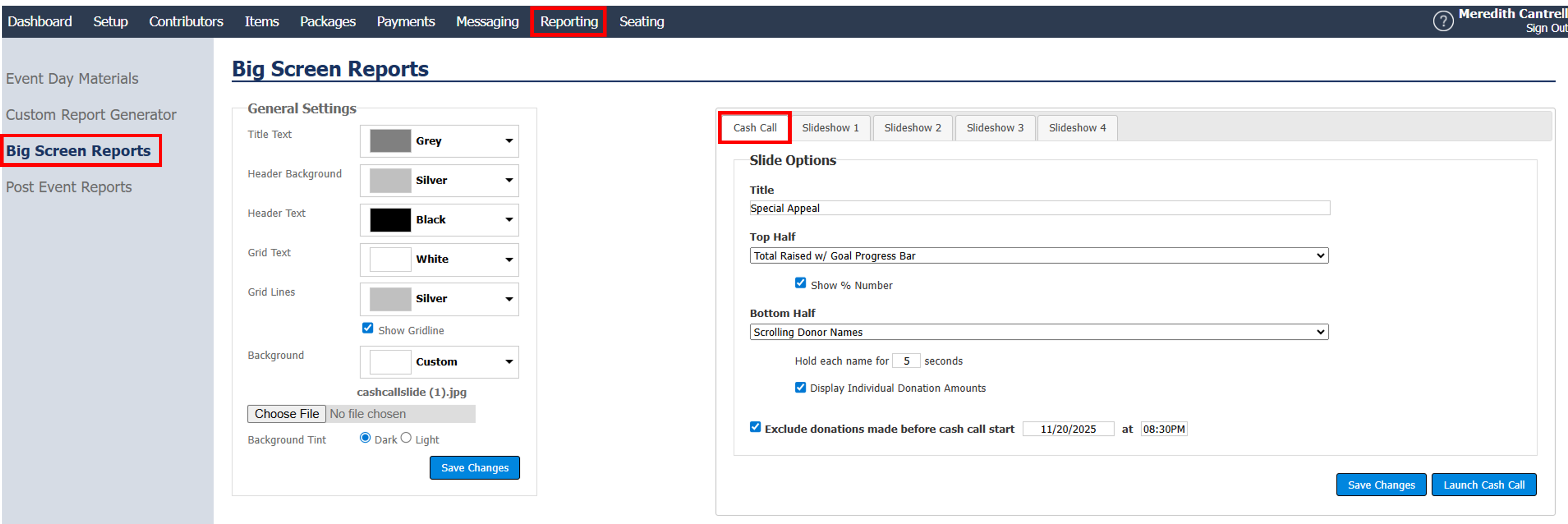 - Under 'Big Screen Reports', find the 'Cash Call' tab.