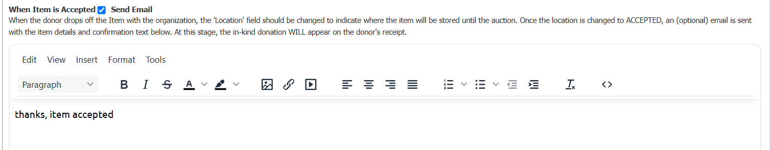- When the item is first submitted in the form, it is tagged with the PENDING location, and the donor is sent a confirmation email. Previously, we would fire a second email when the location was changed away from PENDING to any other location. Now, we are firing that second email when the location is changed to ACCEPTED only.