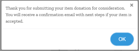 - Changed the confirmation text that appears when a donor submits an in-kind donation. The text is now more clear that the item donation is under review, and may or may not be accepted by the organization.