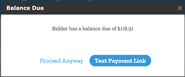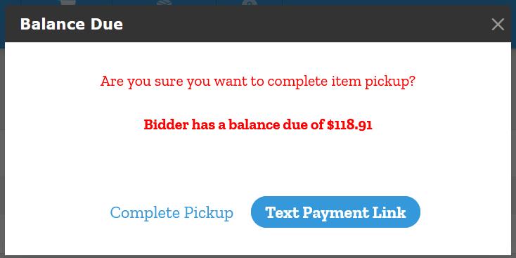 - There is also a second confirmation when pickup is marked complete, if the bidder still has a balance due. The system will allow you to proceed, but use with caution as this could result in uncollected revenue.