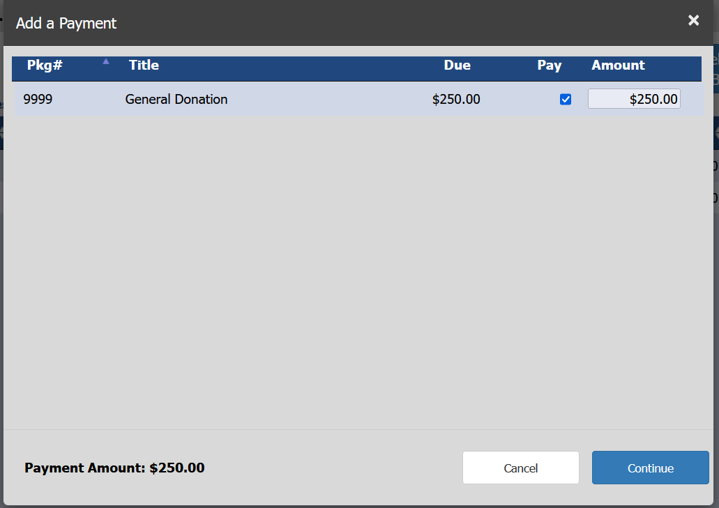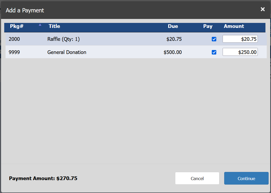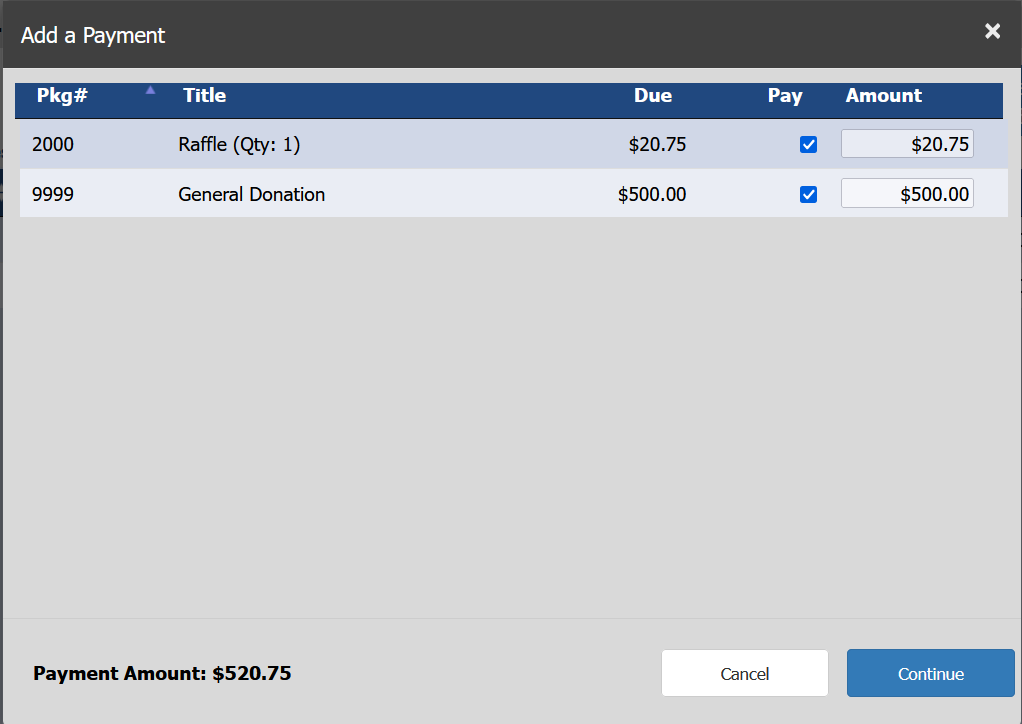 When any payment is added in Event Manager and Auction Conductor, we now prompt the user to select which sales to pay for, and then calculate the payment amount based on that selection.