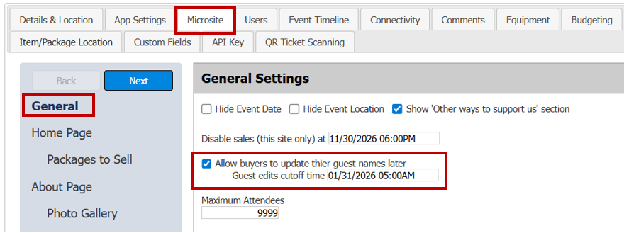 The Allow guest info changes setting determines whether event hosts can update guest names after their initial purchase. By default, this feature is enabled to provide maximum flexibility for your event attendees.