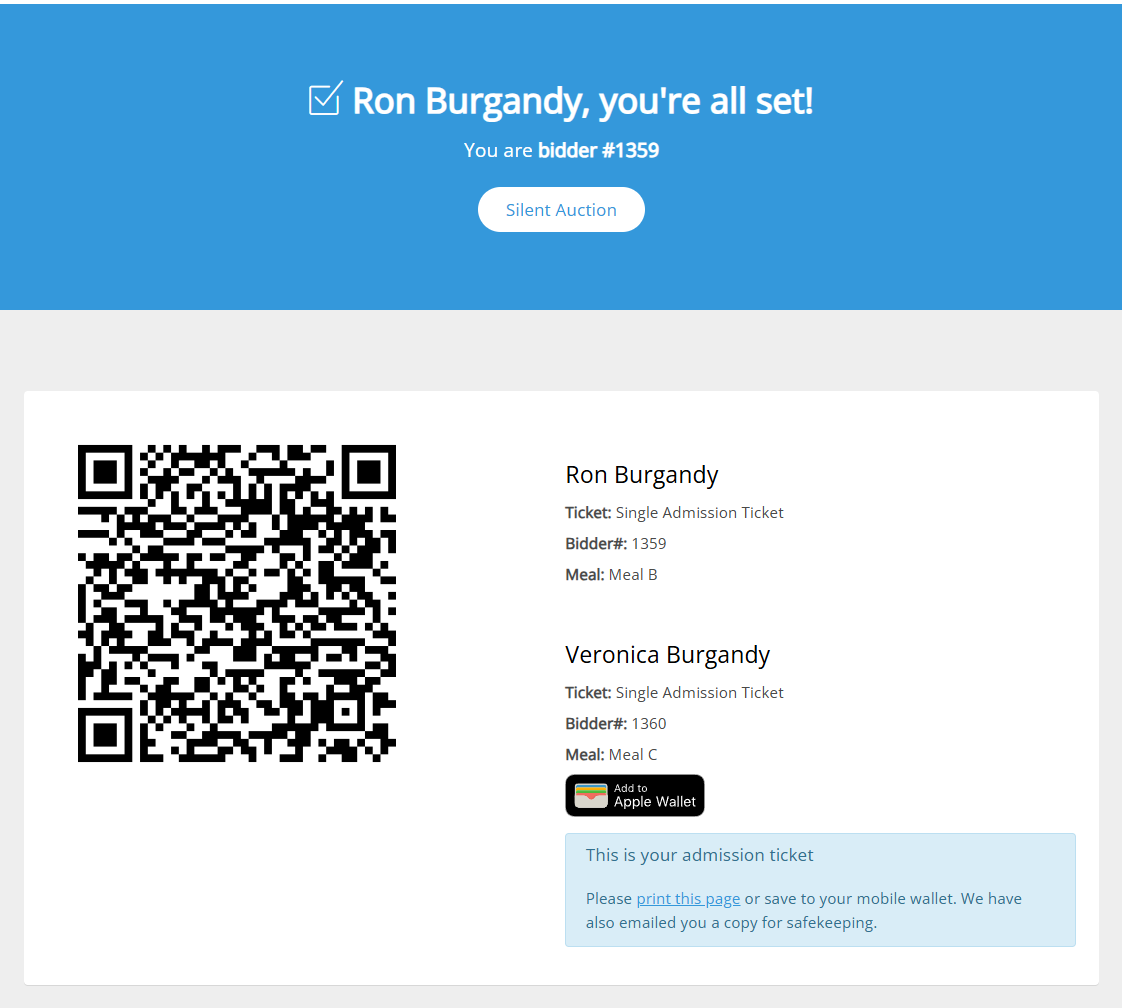 - The confirmation page shows all household members along with their unique ticket numbers, bidder numbers, and table assignments