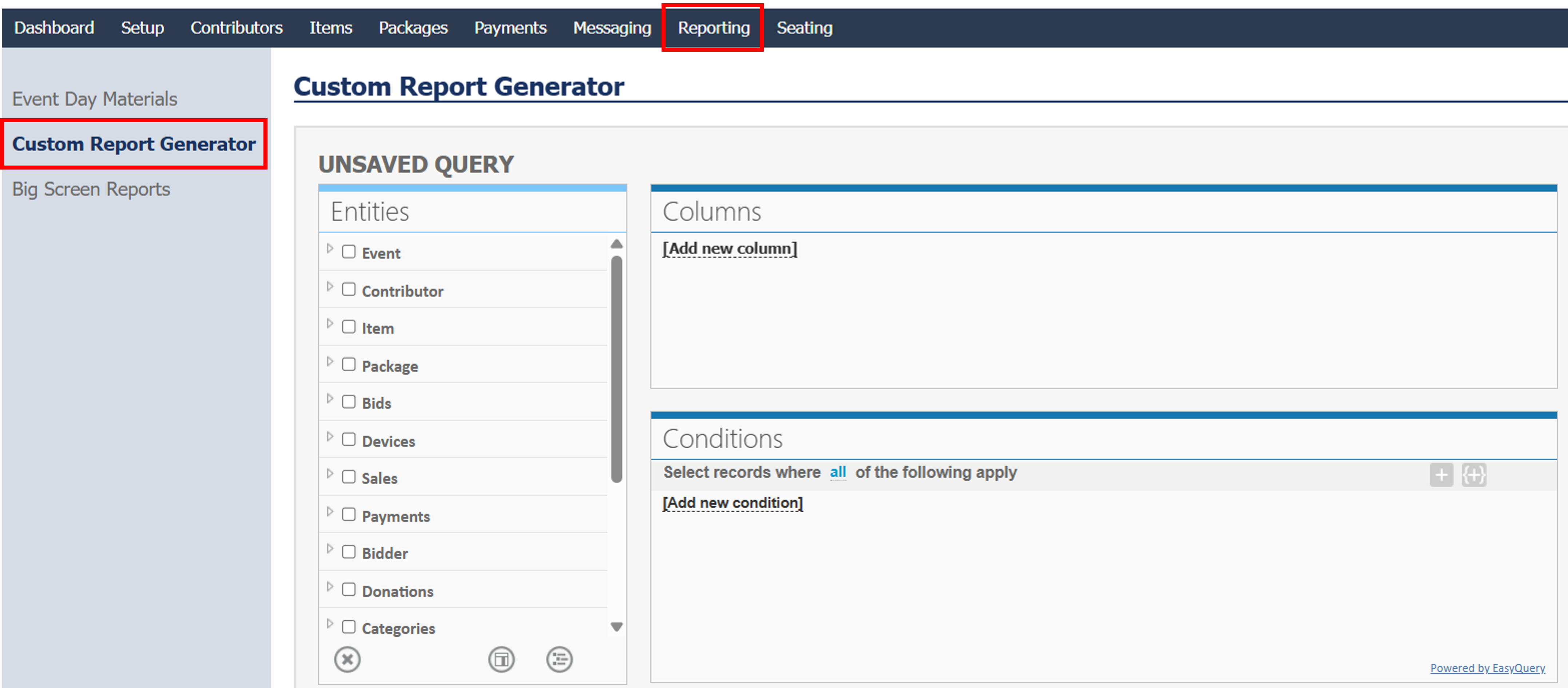 - In Auction Conductor, click the ‘Reporting’ tab, then click on ‘Custom Report Generator'.