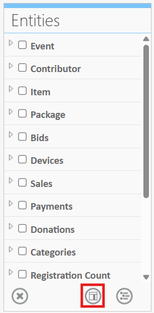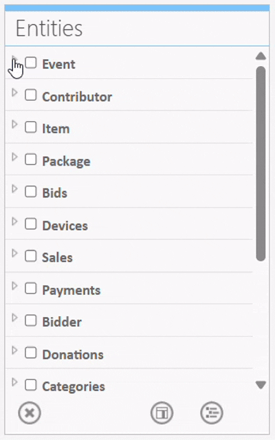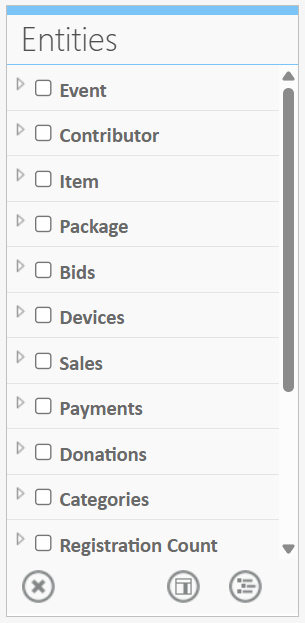 - In the "Entities" section, expand the Entity you want to use by clicking the triangle, then select the box next to each data field you'd like to include in your report. These fields will appear as columns in your exported report.