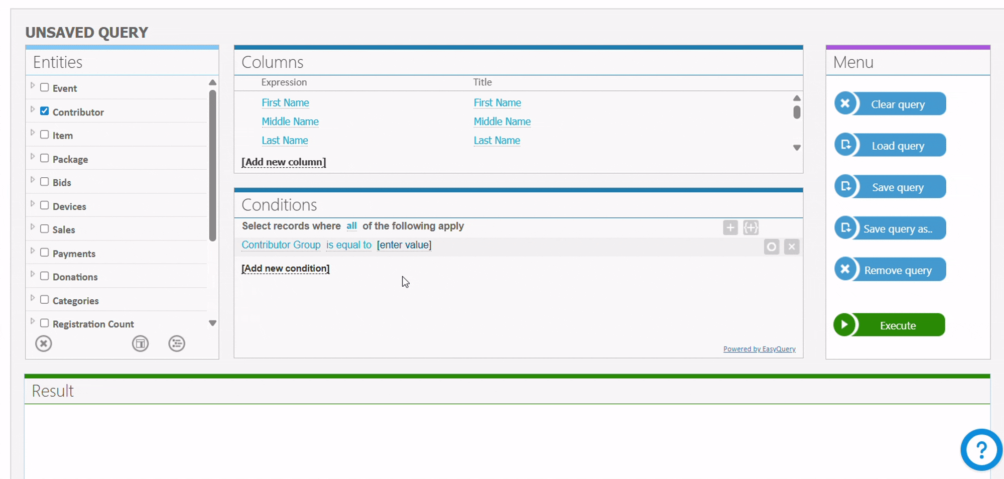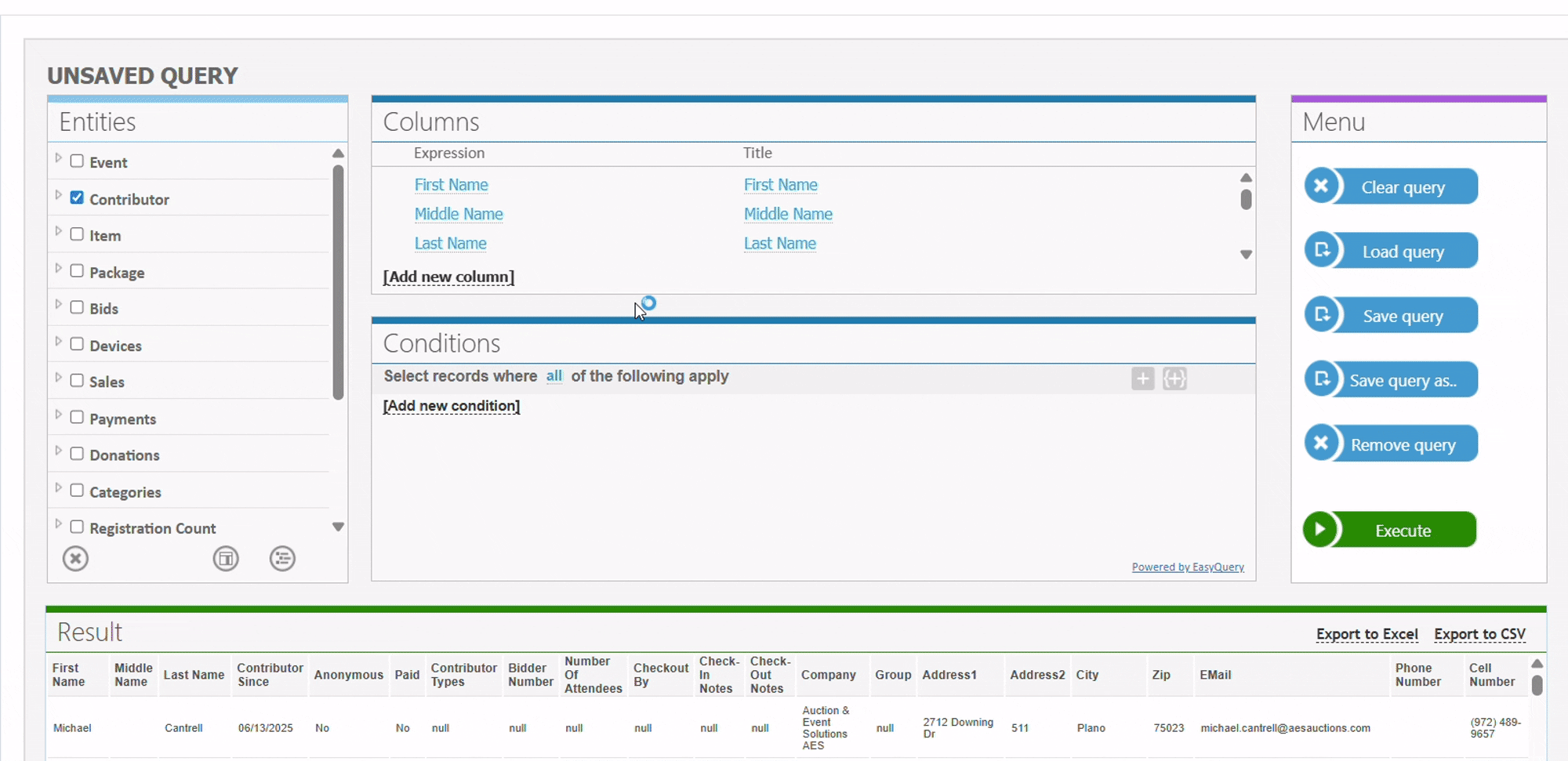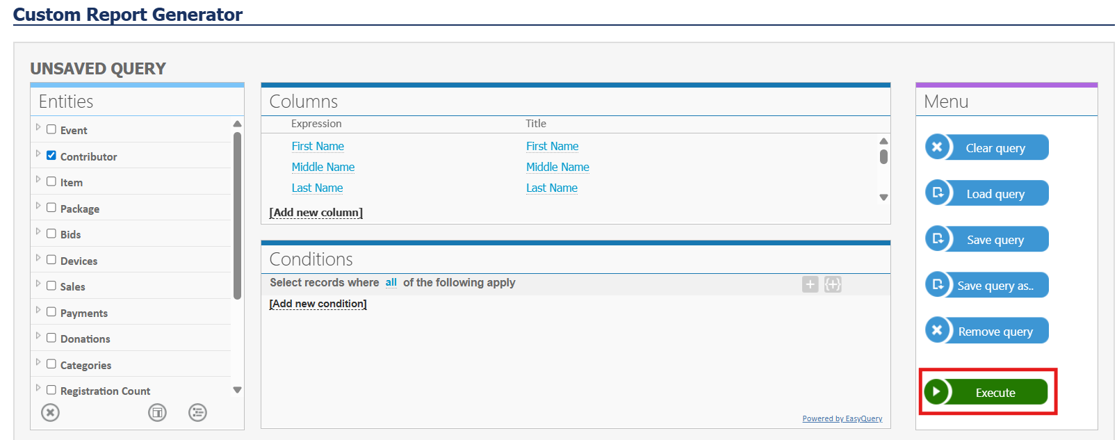 - Click the green Execute button on the bottom right-hand side to preview the report results with your selected columns and conditions. This helps verify accuracy before export.
