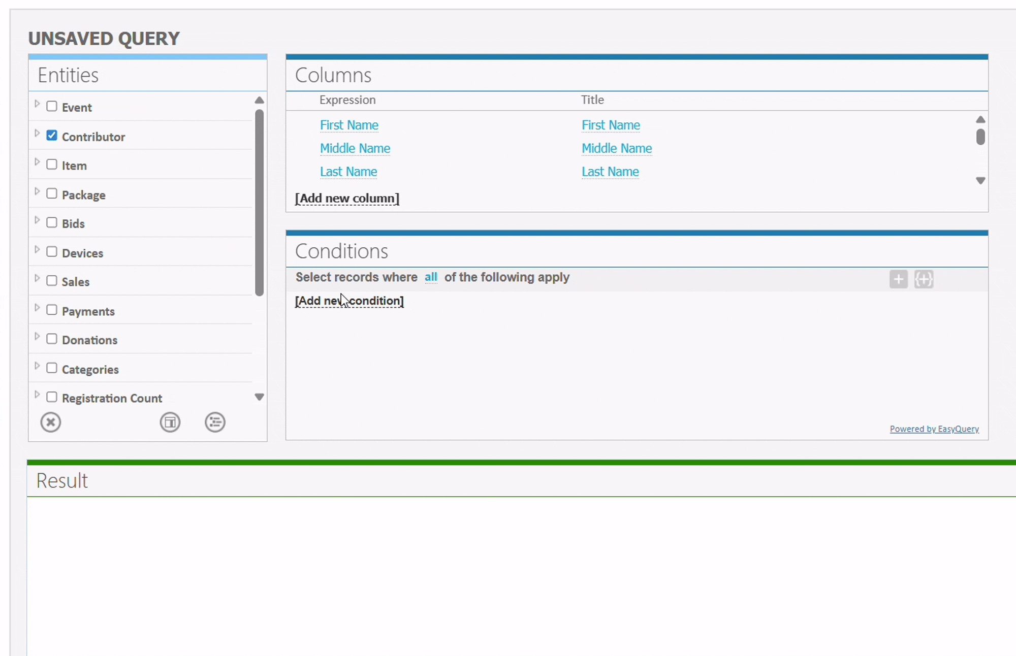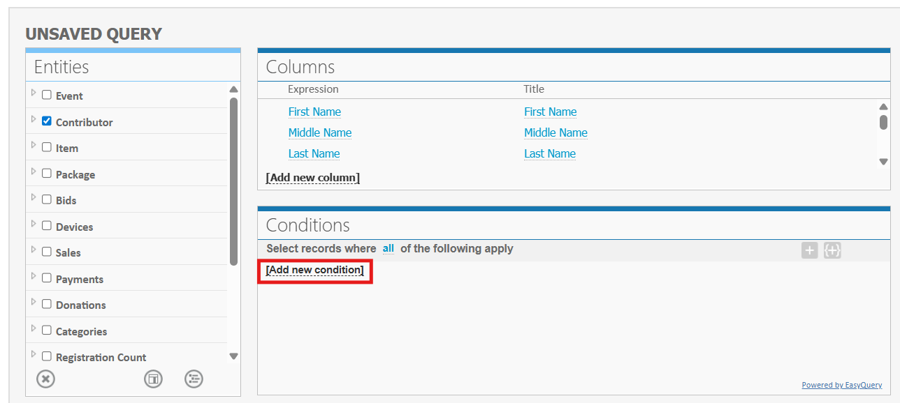 - After you have loaded your Query or selected your Entities, click Add new condition.