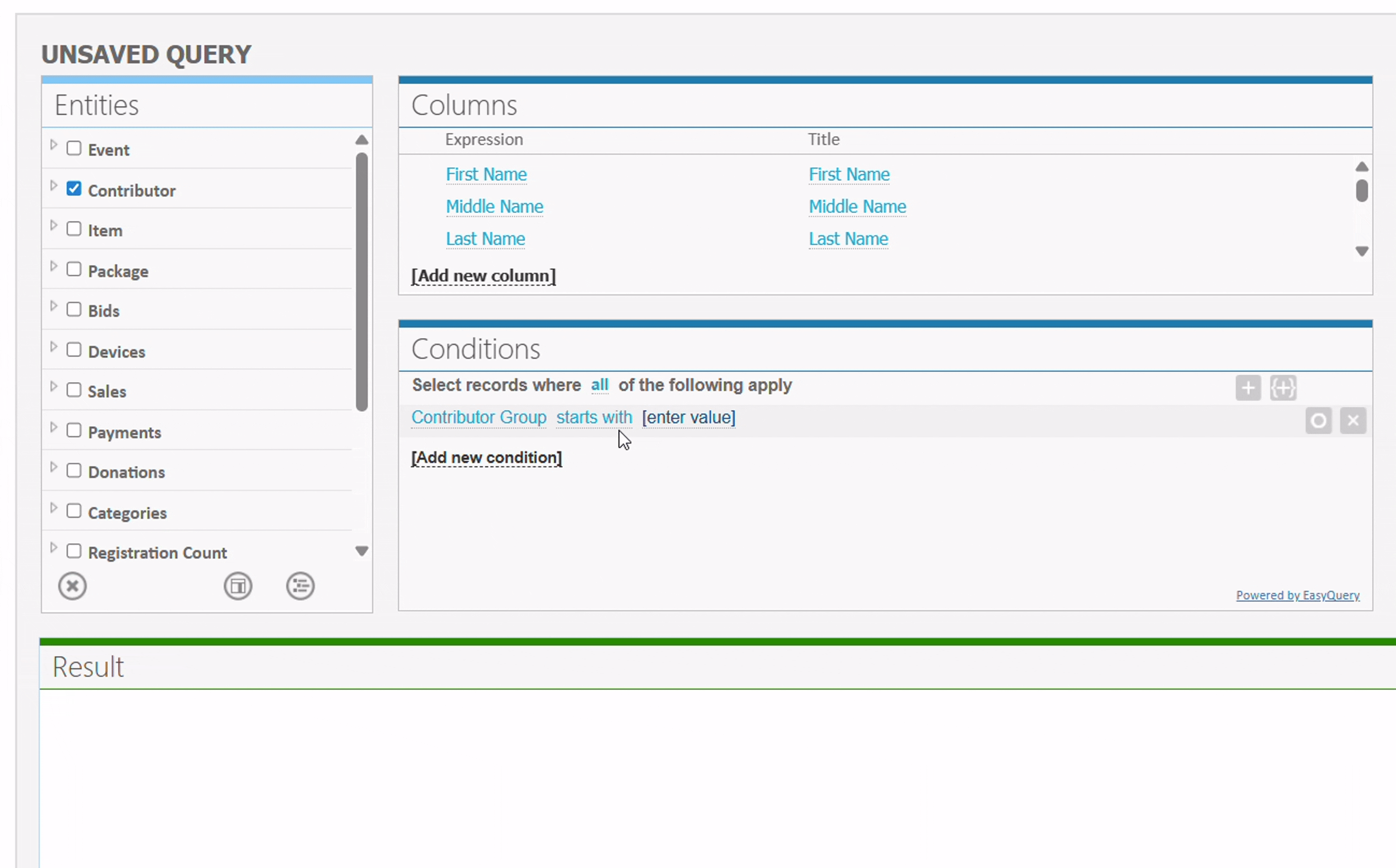 For example, if Contributor is chosen from the Entity list, Contributor must be selected from the condition list - Select the comparison logic (e.g., is equal to, contains).