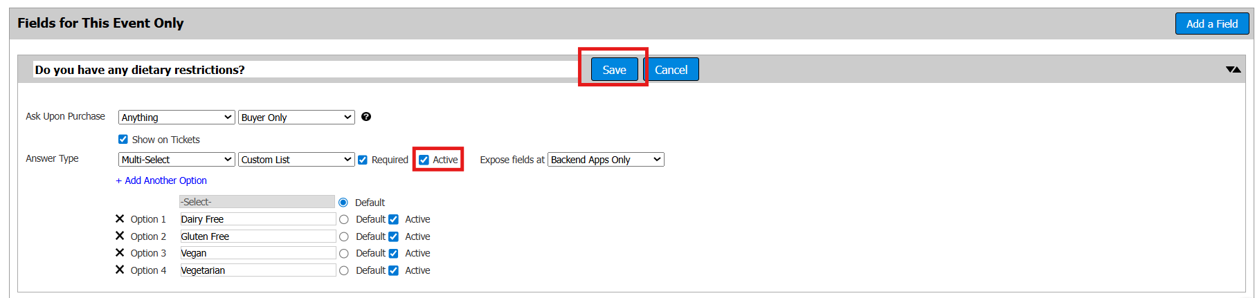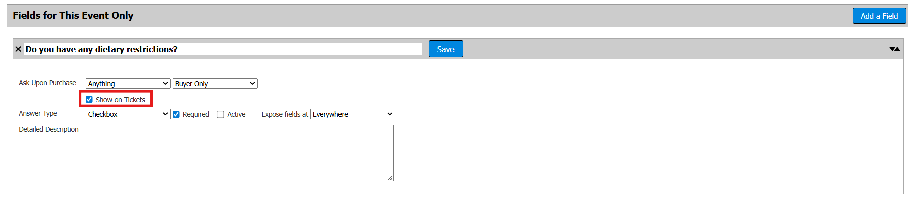 - Choose whether you want to ask the question at every event the organization has or for this event only, click "Add a Field" under that section.