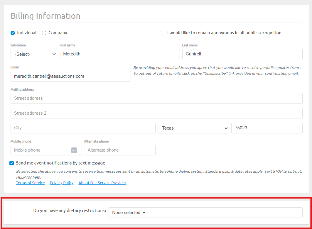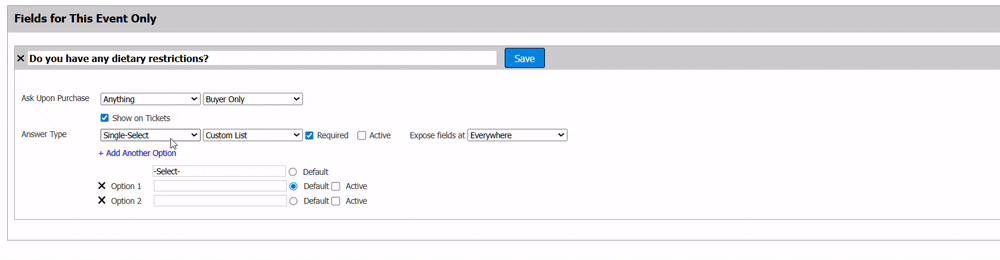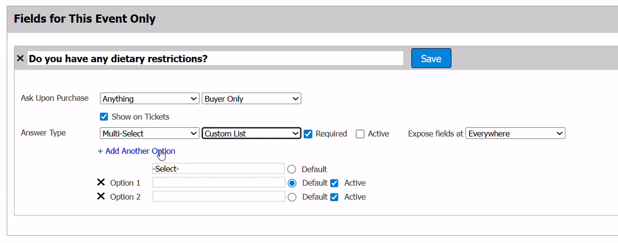 This is helpful if you have guests register separately from their Sponsor/Table Host. Or you can create a Custom List, like dietary restrictions.- If you choose the Custom List, click Add Another Option to enter choices.