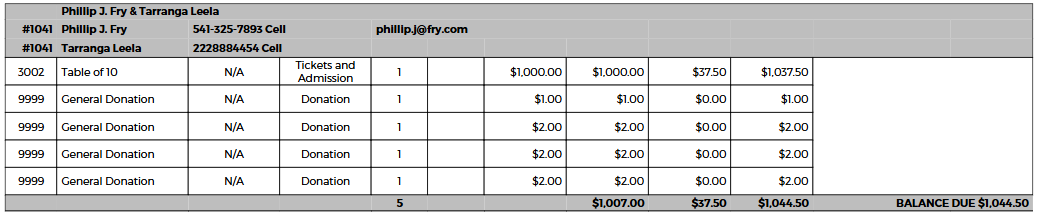 Each household receives one consolidated receipt showing the billing contact's information in the header and all household purchases and payments.